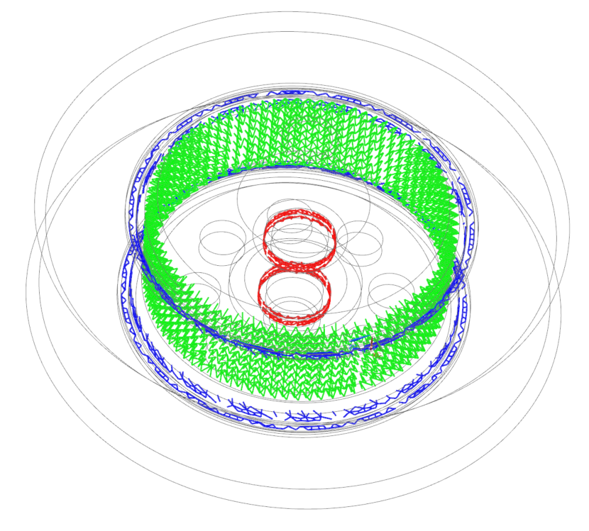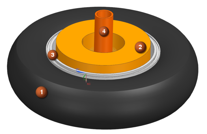 In the following example, the thermal connections are presented for the tire (1), brake pad (2), wheel (3), and axle (4). The blue color shows the connection between the wheel and the tire, the green color shows the connection between the wheel and the brake pad, the red color shows the connection between the axle and the wheel. In the second image, note the incorrect additional connections between the wheel and the break pad, as a result of improper thermal coupling set up. After adjusting the thermal couplings, the third image accurately presents the expected thermal connections.