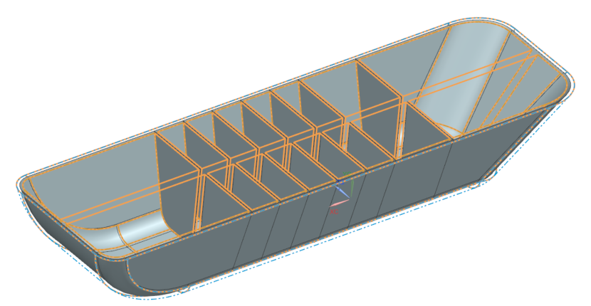 Midsurfaces are defined in the idealized part. You will use thickness to select face pairs to define the midsurface. In this part, the outer walls are about 2.5 mm thick, the lateral ribs are about 1.5 mm thick, and the central rib is about 4 mm thick.