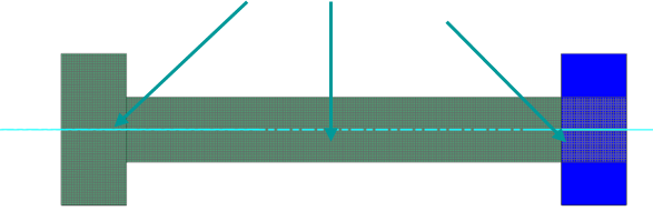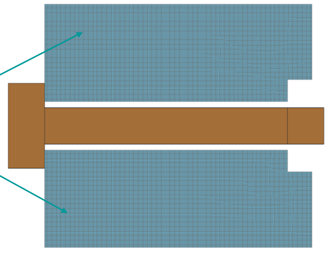 - Repeated cyclic symmetric parts, such as nuts and bolts, around the axis of rotation that are meshed with plane stress elements (presented in brown in the image below). Plane stress elements have associated thickness and number of incrementsthat must be defined.
