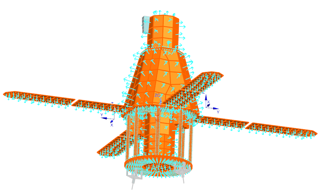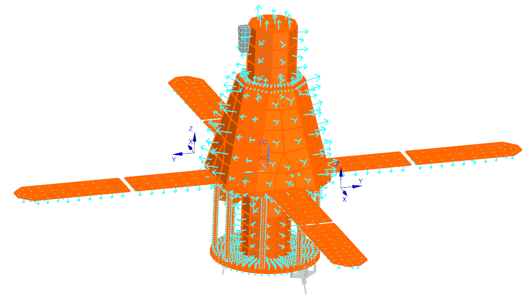 Notice that all the element normals are oriented toward the environment. They will radiate from the top side of the surfaces. However, the solar panels have the bottom and top sides in contact with the environment. Thus, they will radiate from both the top and bottom sides of the surfaces.