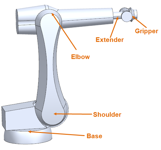The robot arm is designed to help maintenance crew with repairs and construction. It performs limited tasks, such as holding components in a place. It is designed to move slowly to reduce the risk to the crew, during the testing phase. You will model this robot arm motion using articulation. The robot arm model includes five components: base, shoulder, elbow, extender and gripper. The model is meshed and all the material and properties are defined.