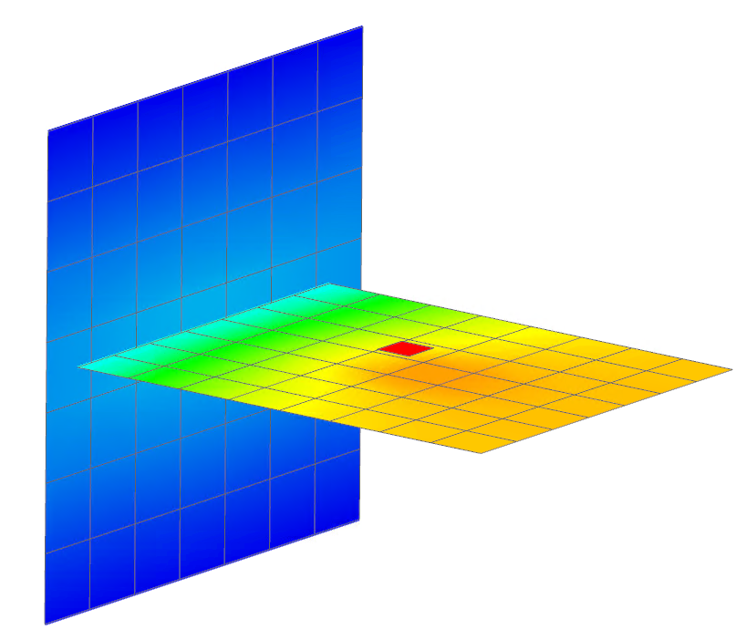 Notice that the results are incorrect. The solver created a thermal conductor between each primary group element and the closest secondary group element. Because the secondary group contains only the single element representing the chip, all elements in the board group are connected to the single element generating the heat. Thus, the temperature distribution is incorrect. The board is also warmer and the chip cooler than the original case.