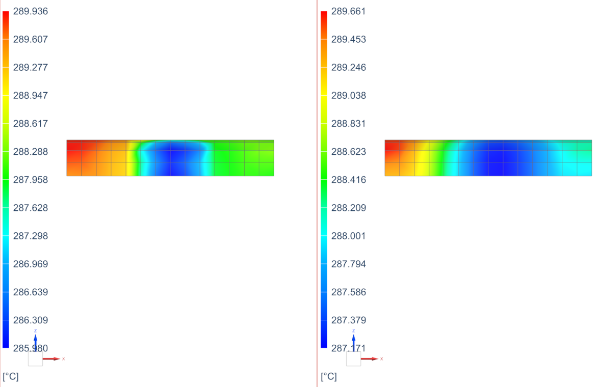 Notice that the temperatures changed. Shadowing is visible on the upper edge of the filament side, but temperatures are still too high.