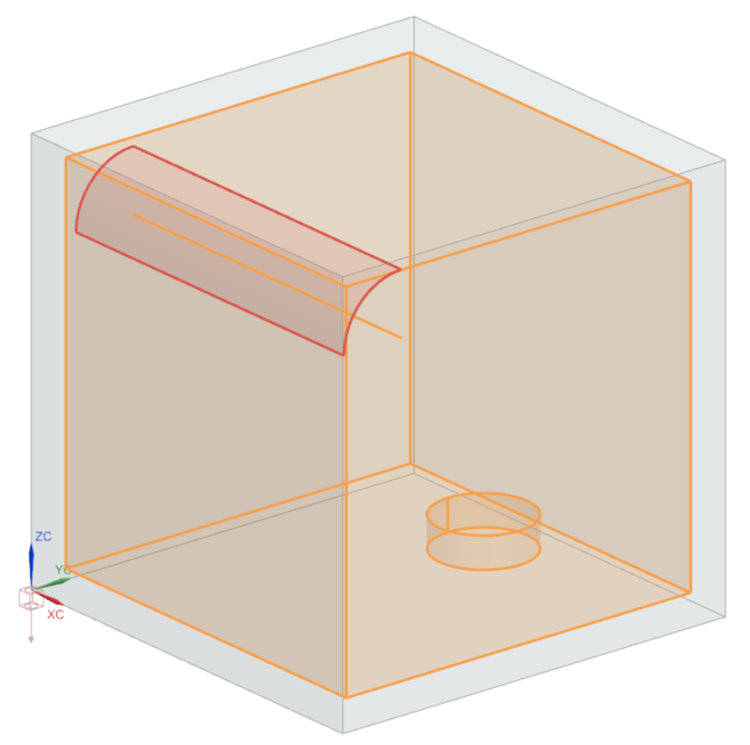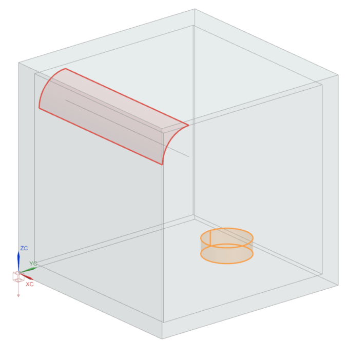 - Radiation Request Inside Oven simulation object: for the Top Side Region, 9 faces are selected (6 inner faces of the oven, 2 faces of the pot, and the filament face) and for the Bottom Side Region, 3 pot faces are selected. Observe that the Elements not Part of this Enclosure Can Shadow check box is selected. This means that even if a section of your model is not included in the radiation request, it will be included in the radiation calculation for shadowing checks. This can be useful for complex geometries, but it requires additional processing time.