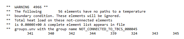 The warning message indicates that 56 elements are not thermally connected to the boundary conditions of the model.