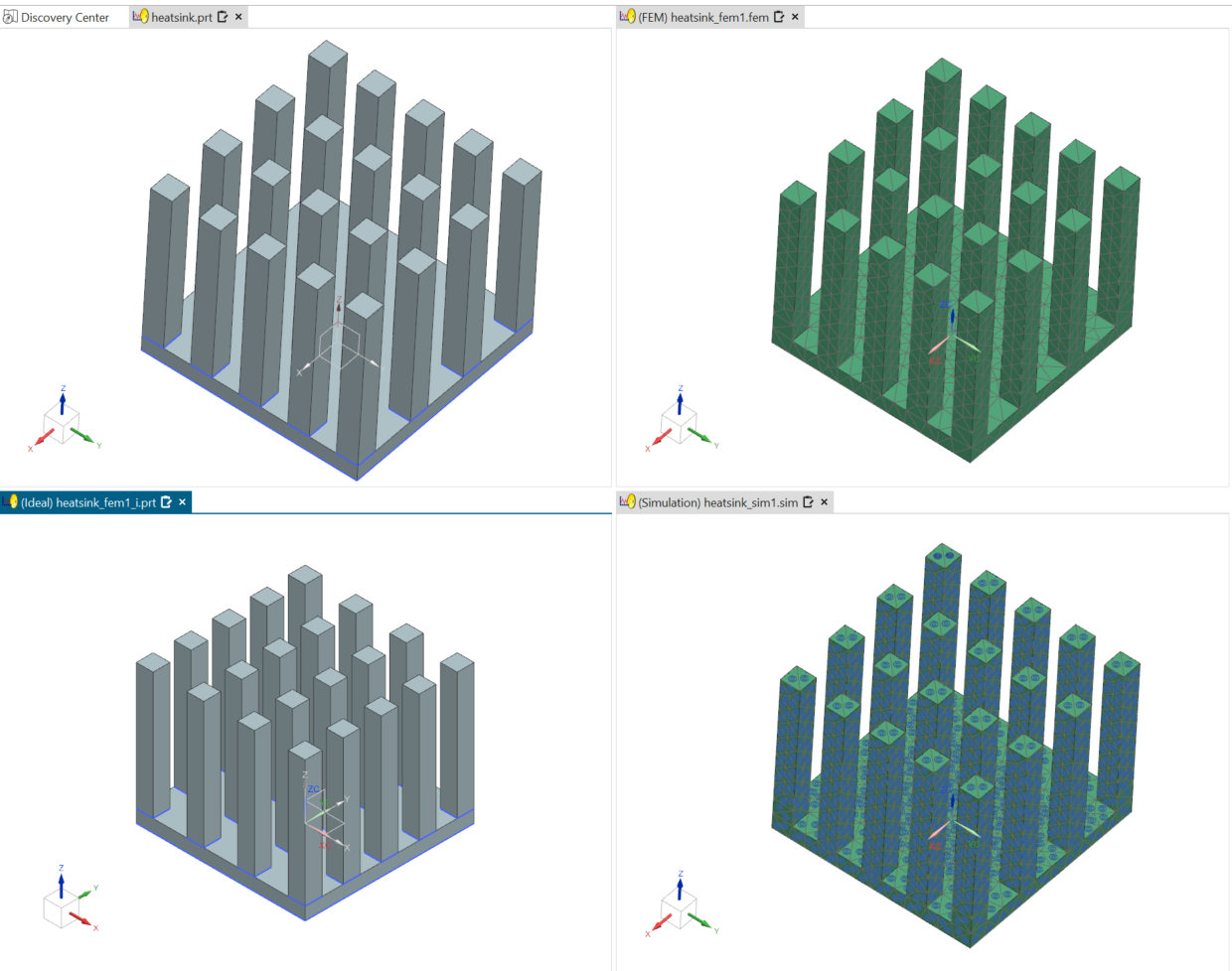 Your graphics window should show four equal sized windows containing the master part, idealized part, FEM file, and Simulation file.